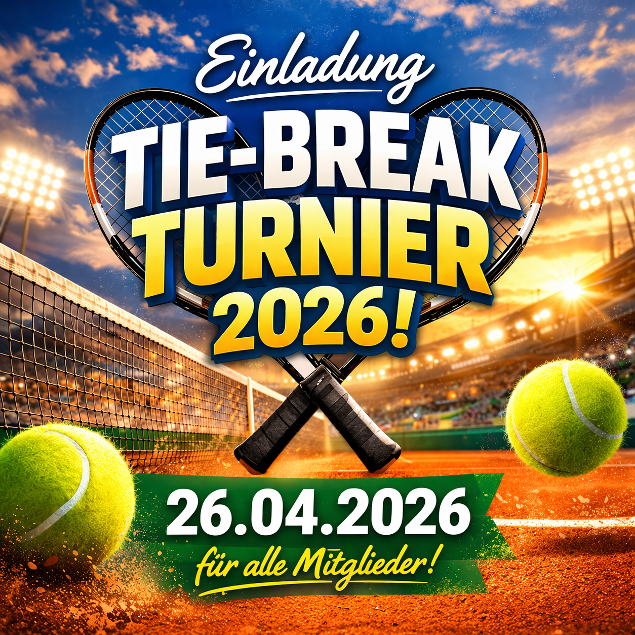 Wir starten wie auch schon in den letzten beiden Jahren mit einem Tie-Break Turnier in die Sommersaison. Am 26.04.2026 spielen wir ein KO Turnier für Damen und Herren im Tie-Break Modus (Match Tie-Break bis 10, Best of 2).